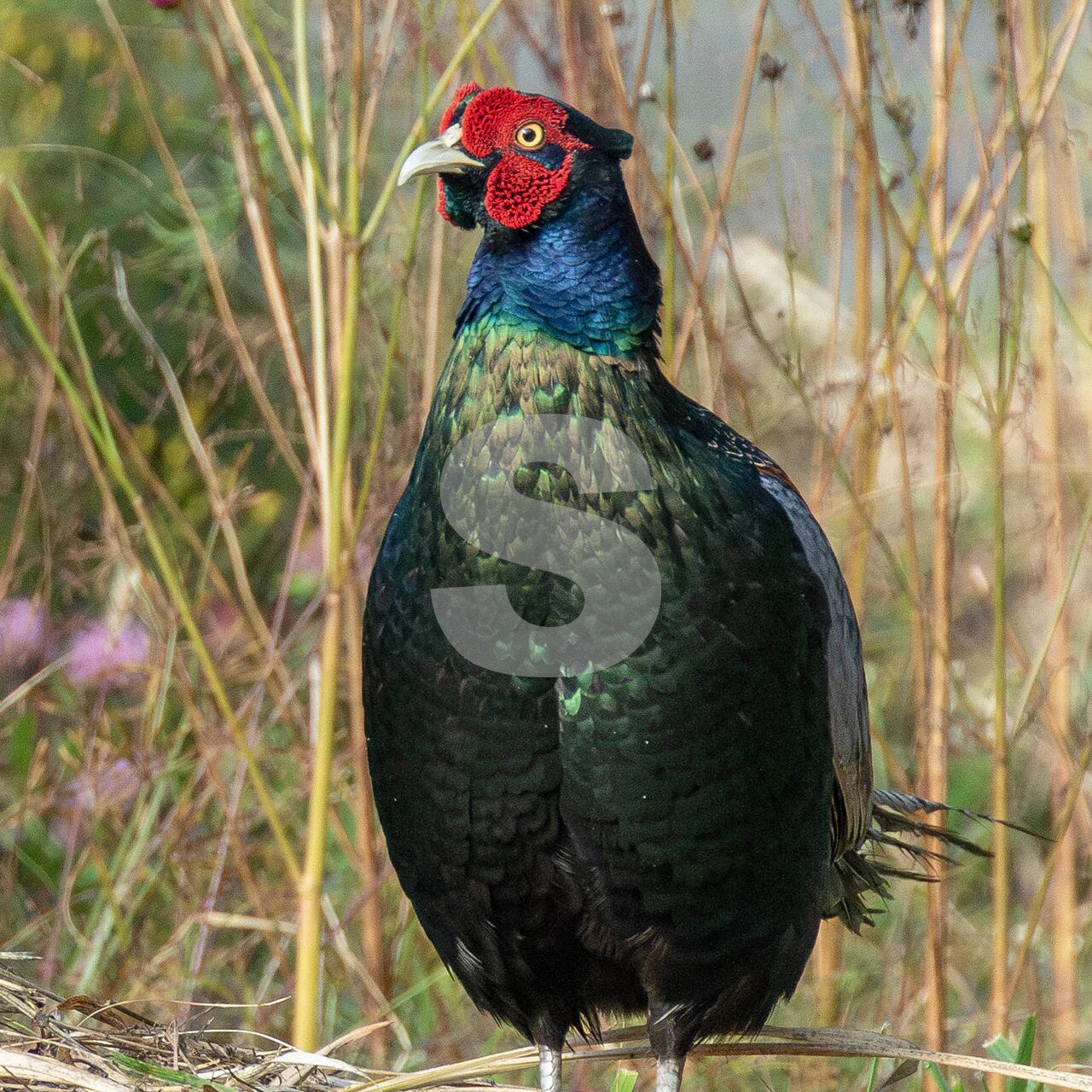 被写体:朝の日差しを浴びて枯れたコスモスの脇に佇むオスのキジ