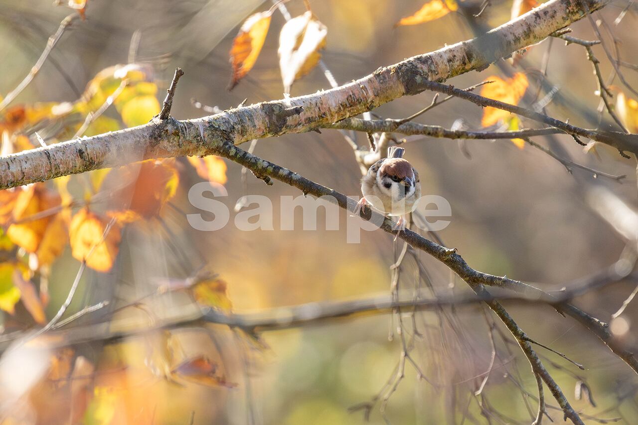 被写体:秋の柔らかな日差しを浴びてシラカバの枝に止まるスズメ