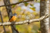 被写体:秋色の森を背景にシラカバの枝で休むオスのジョウビタキ