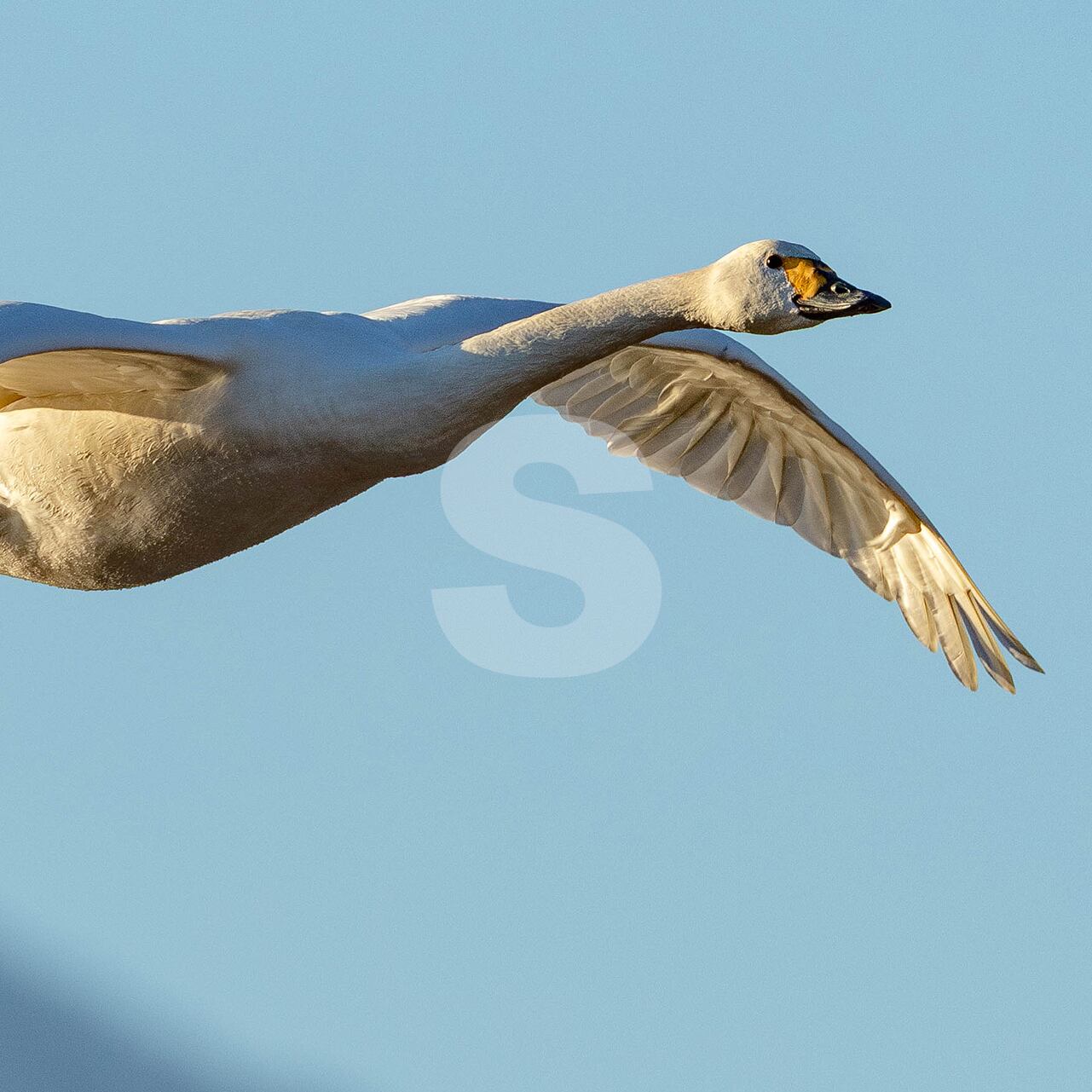 被写体:残照を浴びながらねぐらへ帰る安曇野のコハクチョウ